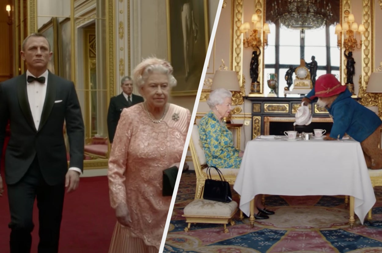In the sketch, the late monarch briefly addressed 007 before the two were seen entering a helicopter, which flew over the stadium, ending with a stunt double of the Queen parachuting into the arena.